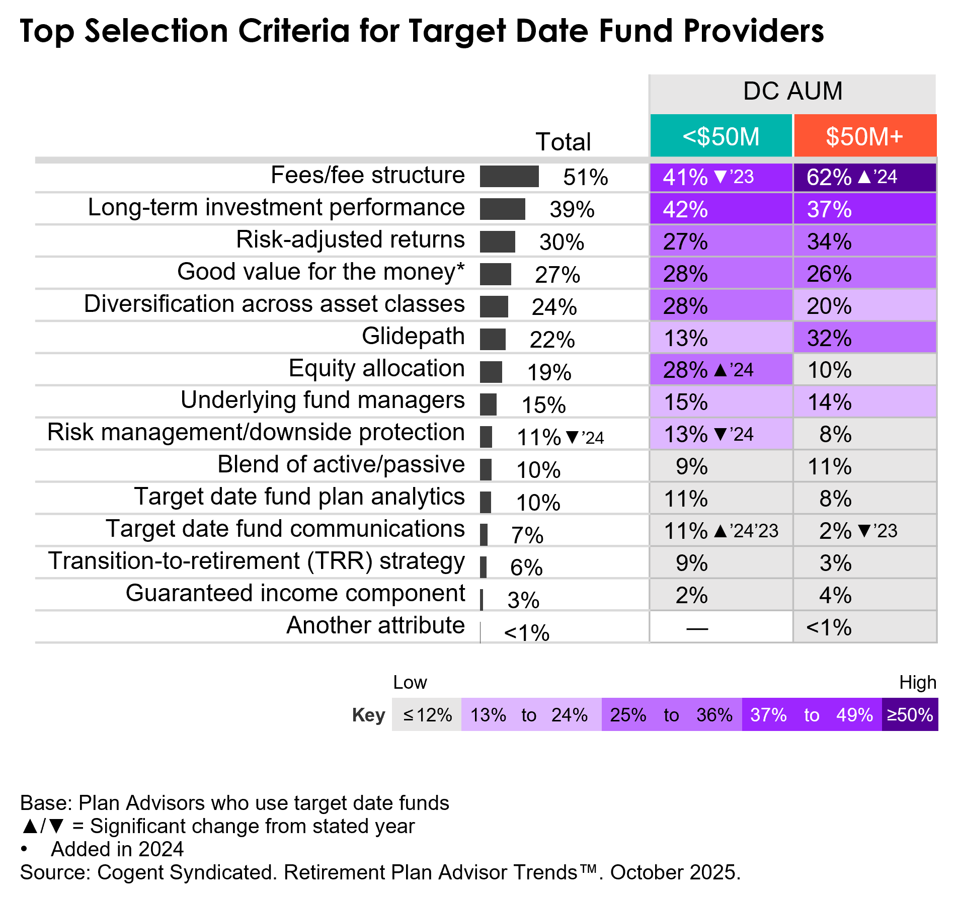Our latest findings reveal fees are increasingly paramount to target date fund provider selection among advisors managing at least $50 million in DC AUM. In fact, more than six in ten $50 million-plus producers are vetting target date fund providers via fees (62%, a notable uptick from 43% in 2024). In contrast, there is less emphasis on target date fund communication within this cohort (2% vs. 9% in 2023).