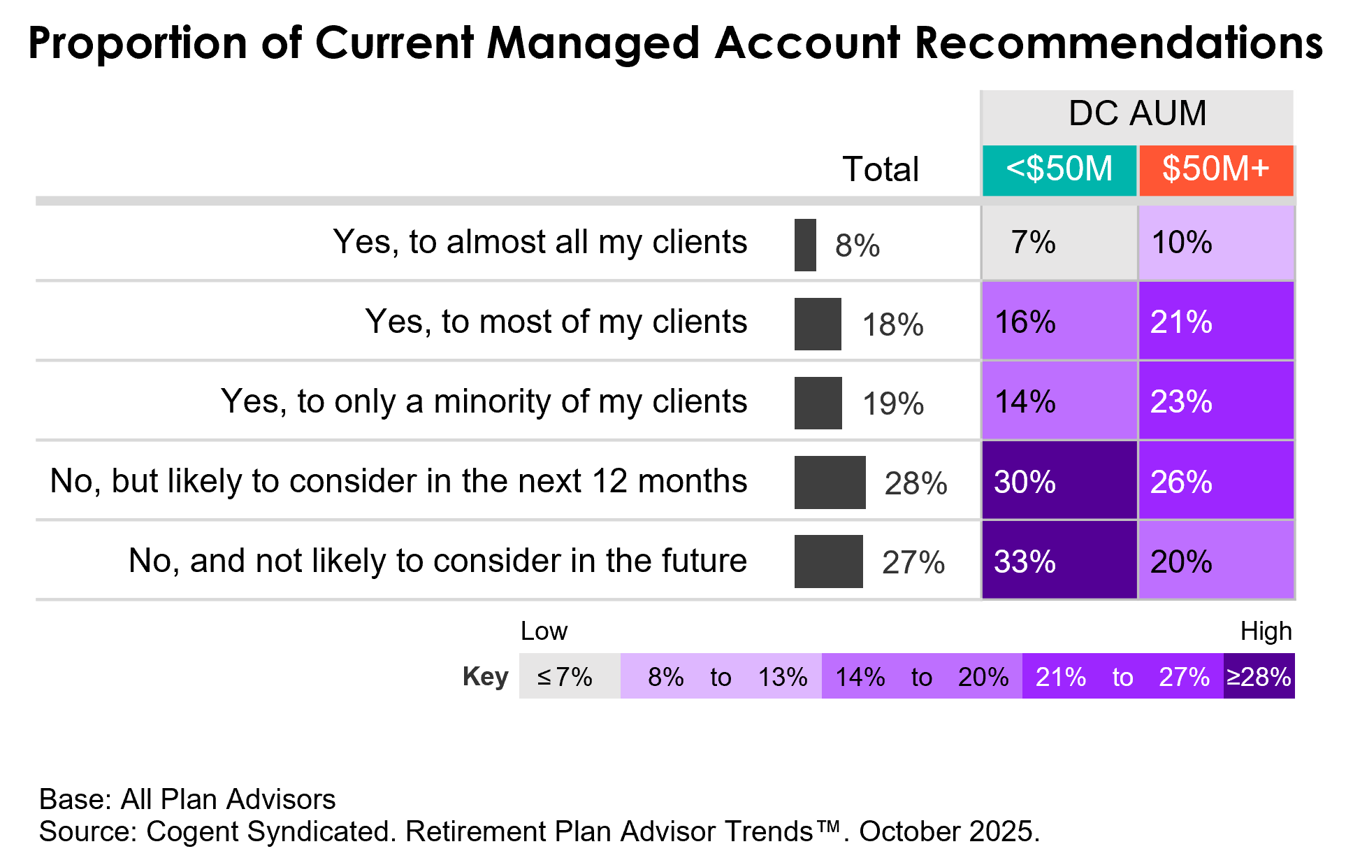Meanwhile, managed accounts are also gaining traction in the marketplace, with more than half of $50M+ DC advisors (54%) actively recommending managed accounts for plan sponsor consideration in at least some capacity.