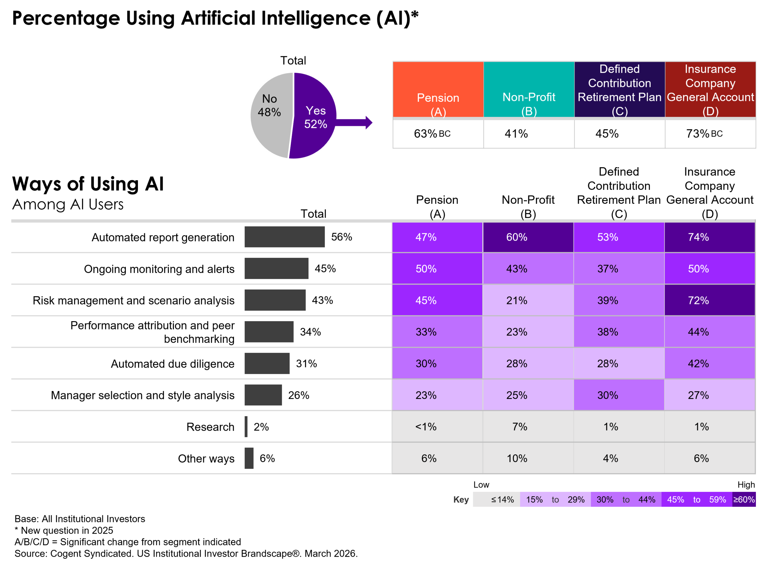 Brand strength in this environment is neither static nor guaranteed. Traditional broad asset managers are scrambling to reposition themselves as specialized alternative asset managers disrupt the market. Meanwhile, the forces shaping manager selection are themselves changing. Over the past two years, DEI considerations have collapsed as a selection criterion, ESG enthusiasm has declined, and consultant recommendations, though still influential, are being supplemented by a new generation of decision-making tools—enter AI. Escalent’s Cogent Syndicated research show more than half of all institutional investors now deploy artificial intelligence in asset management, a development that institutional marketing leaders must account for both in how they position their own capabilities and in how they design and execute client interactions.
