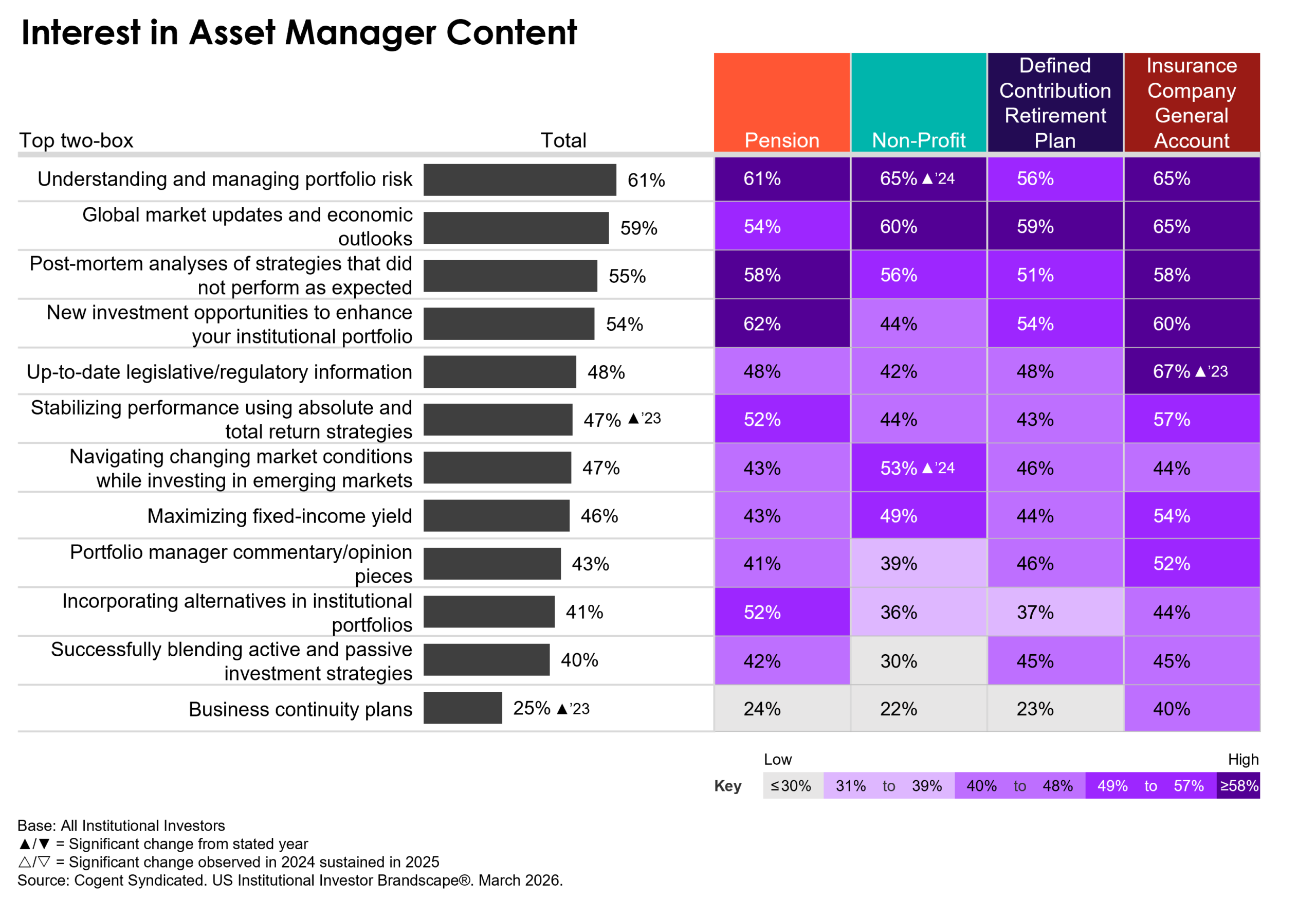 Winning the battle for institutional mindshare requires a disciplined, channel-aware approach to engagement. In-person visits and industry conferences are the dominant preferred methods for evaluating and selecting new managers among institutional investors, while emails are the top choice for monitoring current managers. Investment consultants continue to serve as the primary information source for more than half of institutions, making intermediary relationships a nonnegotiable component of any go-to-market strategy. Content must address the topics that institutional investors most value: understanding and managing portfolio risk, global market updates and economic outlooks, and incorporating alternatives into institutional portfolios. The firms that align their positioning, content and engagement strategies to these data-driven insights will be best positioned to convert brand awareness into meaningful consideration for new mandates.