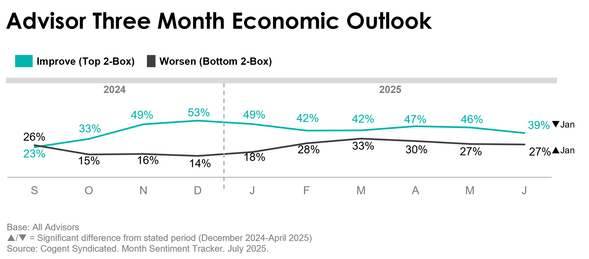 At the end of June 2025, over one-quarter (27%) of advisors indicated that they expect the economy to worsen over the next three months—a feeling that has risen sharply since the end of last year along with a decline in optimism. In revealing their leading concerns, advisors identified issues such as tariffs impacting profits and stocks (45%), geopolitical events (40%), government decisions (36%), and stock market volatility (32%).